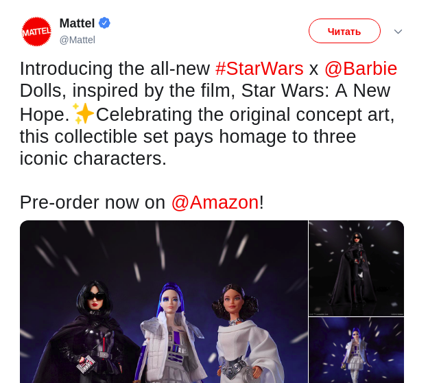 Компания Mattel создала новую коллекцию игрушек Барби, сделанных по мотивам фильма "Звёздные войны. Эпизод IV: Новая надежда". Сейчас есть только три игрушки-персонажа: принцесса Лея, Дарт Вейдер и дроид R2-D2. Об этом компания написала в своем Twitter.