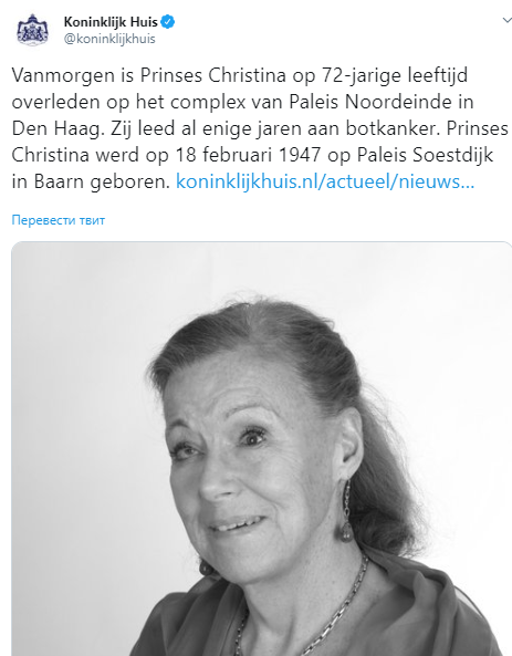 В Нидерландах на 73-м году жизни после длительной борьбы с онкологическим заболеванием скончалась принцесса Кристина. Об этом пишет France24.