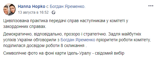 "Цивилизованная практика передачи дел преемникам в комитете по иностранным делам. Демократично, ответственно, прозрачно и стратегически. Для будущих успехов Украины обсудили с Богдан Яременко приоритеты работы комитета, поделилась опытом работы 8 созыва. Символическое фото на фоне карты Идель-Урала - сознательный выбор", - написала Гопко под фотографией.