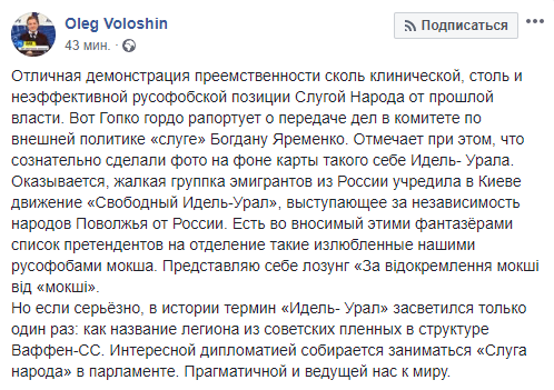 "Но если серьёзно, в истории термин "Идель-Урал" засветился только один раз: как название легиона из советских пленных в структуре Ваффен-СС. Интересной дипломатией собирается заниматься "Слуга народа" в парламенте. Прагматичной и ведущей нас к миру", - подытожил Волошин.