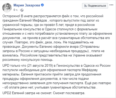 "Осторожно! В инете распространяется фейк о том, что российский гражданин Евгений Мефёдов , которого выпустили под залог из украинской тюрьмы, где он провёл 5 лет, придя в российское Генеральное консульство в Одессе столкнулся с формальным отношением и с него потребовали установленную плату за оформление документов , не приняв в расчёт все гуманитарные обстоятельства его случая. Повторю, это фейк, деза, ложь. Не поддавайтесь на провокации. Документы Евгению оформили вчера (Отправлены запросы в Россию и запущены необходимые процедуры) , плата не взималась. Российские представительства на Украине оказывают россиянину консульскую помощь", - написала она.