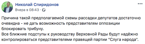 "Все ближние подступы к руководству Верховной Рады будут надежно контролироваться представителями правящей партии "Слуга народа", - написал в Facebook Николай Спиридонов.