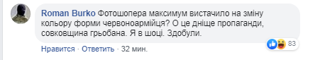 "Фотошопера максимум хватило на изменение цвета формы красноармейца? Вот это днище пропаганды, совковщина... Я в шоке", - прокомментировал Роман Бурко.
