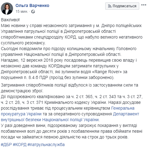 Как сообщала в конце июля "Страна", высокопоставленный чиновник Виталий Глуховеря 12 сентября 2018 года незаконно дал команду сотрудникам спецназа КОРД задержать патрульных в Днепропетровской области, которые остановили водителя "Range Rover" за нарушение п. 8.4.бы ПДД (проезд без остановки запрещен), что попало на видео.