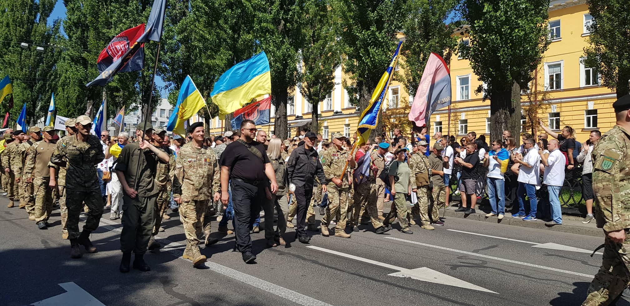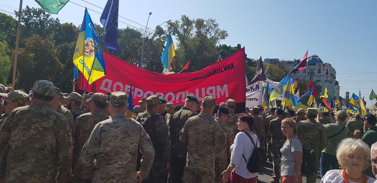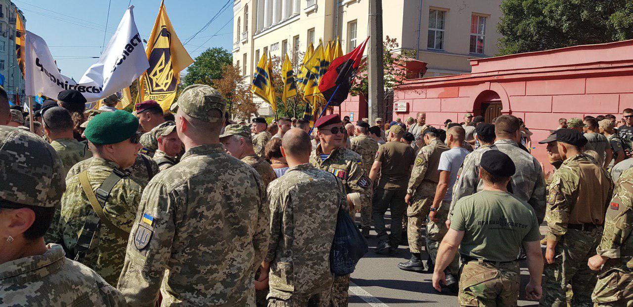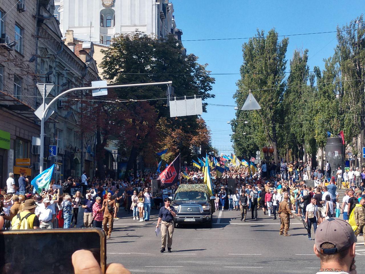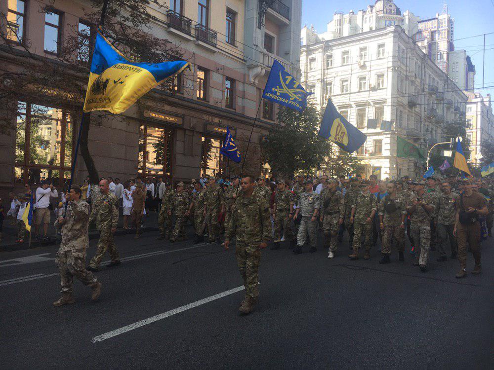 12:20 В колонне Марша националистов следующее размещение: за матерями и детьми  погибших участников АТО идет колонна города Киев. За ним - в сером камуфляже представители Муниципальной варты (скорее всего, это представители С14, переодетые в форму Варты - Ред.), за ними батальон "Киевская Русь", потом "Айдар". Потом - в колонне ветераны 93 бригады.