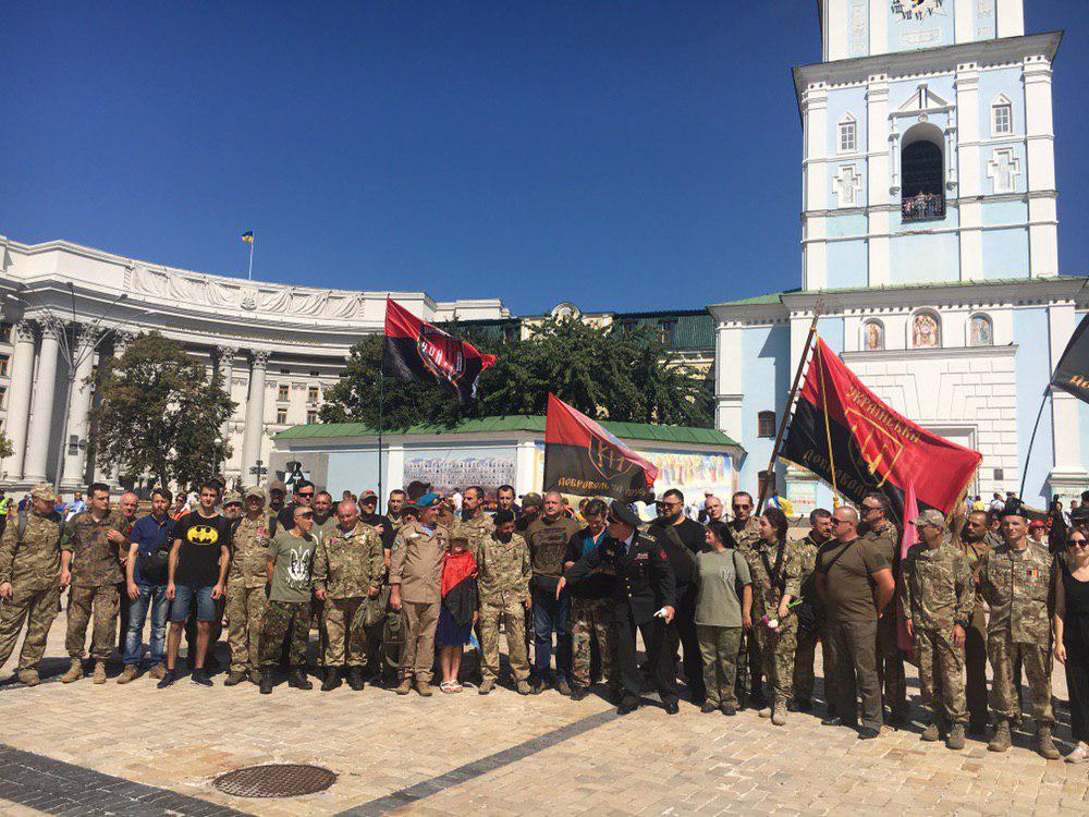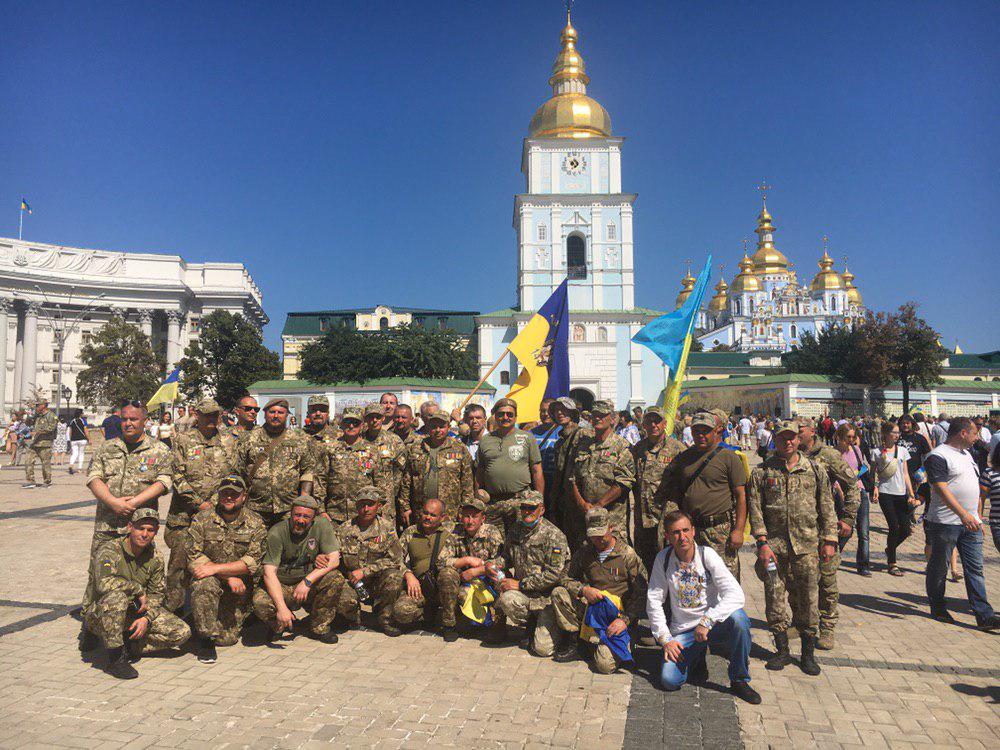 С 11:00 до 13:00 свое шествие проведут и националисты. "Марш защитников Украины", в котором заявлены участники АТО, семьи погибших и волонтеры, пройдет от парка Шевченко до Майдана. Там во второй раз за день исполнят гимн. После этого военные капелланы ПЦУ проведут молебен по погибшим на Михайловской площади.