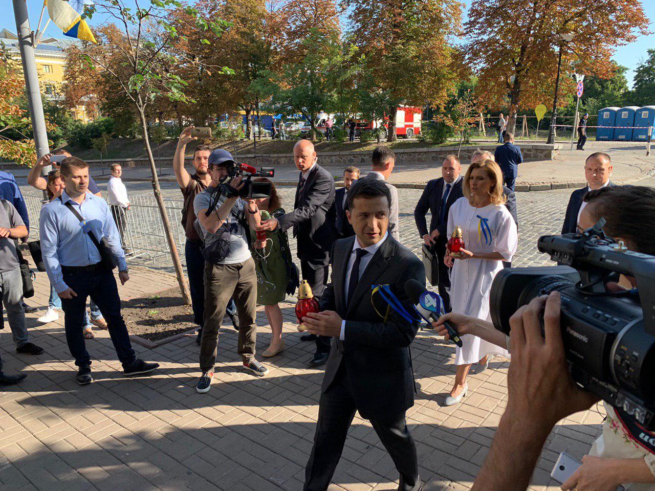 09:14 На Грушевского подъехал президент. Журналисты попросили у Зеленского комментарий, он на секунду остановился, повернулся к прессе и поздравил их с Днем независимости на украинском языке.