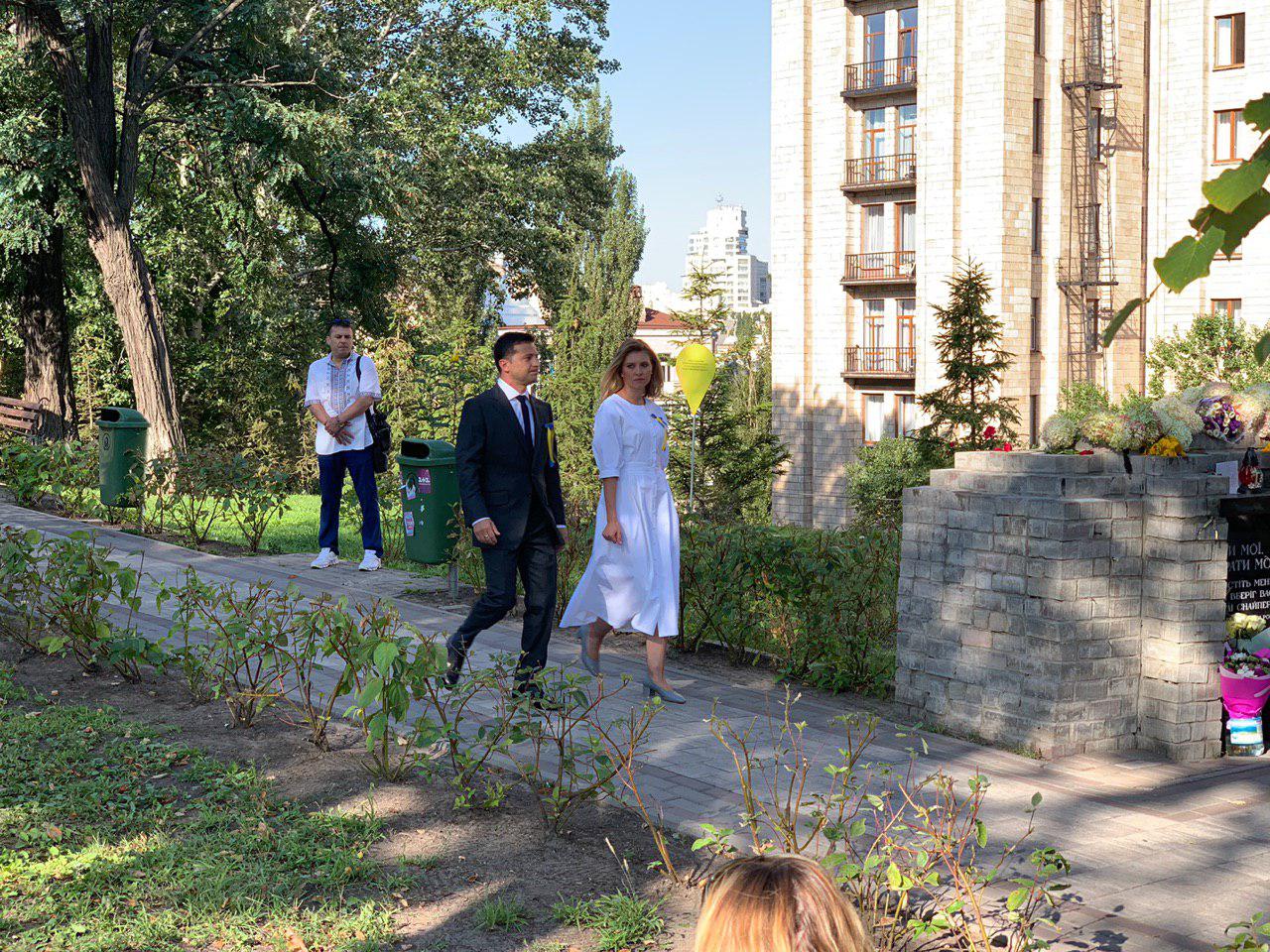 09:36 Зе и его супруга спускаются вниз в сторону Крещатика, чтобы положить цветы. За ними идут дети в белом. Рядом поет Онука. Стоит признать, что картинка получается эффектной.