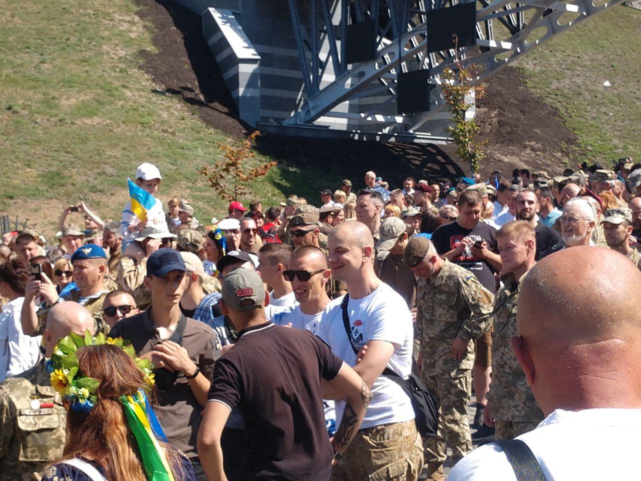 13:55 На Михайловской ветераны АТО из Украинской добровольческой армии фотографируются на фоне собора. Вообще сюда прибыла небольшая часть участников марша. До тысячи человек суммарно вместе с зеваками и зрителями, а также туристами.