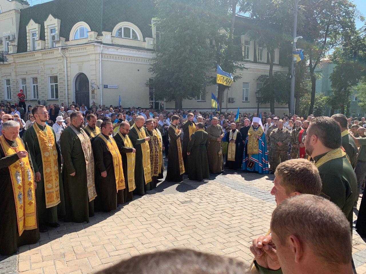 13:32 На Михайловской площади, куда двинулась часть участников марша ветеранов АТО Епифаний проводит молебен, вспоминая погибших защитников Украины. Это была Заупокойная молитва за героев, поникших при защите территориальной целостности Украины