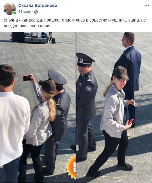 11:13 Журналист Оксана Богданова сообщает, что в центр Киева приходила и и.о. главы Минздрава Ульяна Супрун. Правда, её визит был короткий: "Ульяна - как всегда: пришла, отметилась в соцсетях и ушла... ушла, не дождавшись окончания".