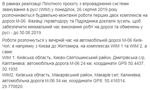 Две из шести площадок для автоматического взвешивания в движении на дороге М-06 будут установлены с 26 по 30 августа. Работы стартуют вечером на автодороге М-06 Киев-Чоп в направлении из Киева в Житомир, на комплексах WIM 1 (Киево-Святошинский район, с.Капитановка) и WIM 2 (Макаровский район, пгт.Калиновка).