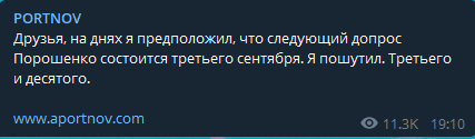 "Друзья, на днях я предположил, что следующий допрос Порошенко состоится третьего сентября. Я пошутил. Третьего и десятого", - написал он.