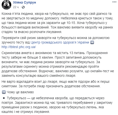 Глава Минздрава Ульяна Супрун сообщила, что каждый человек, больной туберкулезом, не знает о своем диагнозе и не обращаются за медицинской помощью. В чем главная опасность туберкулеза и как вовремя выявить болезнь Супрун написала на своей странице в Facebook.