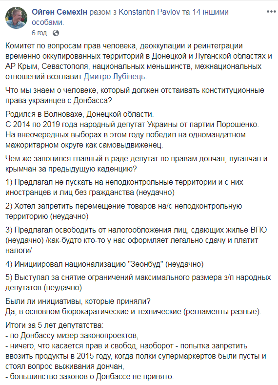 Так например, эксперт Евгений Семехин опубликовал в своем Facebook, нечто вроде краткой справки на нового главу Комитета по вопросам прав человека, деоккупации и реинтеграции временно оккупированных территорий Дмитрия Лубенца..