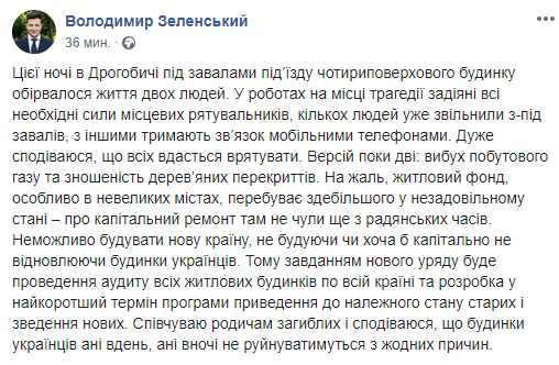 "Этой ночью в Дрогобыче под завалами подъезда четырехэтажного дома оборвались жизни двух людей. В работах на месте трагедии задействованы все необходимые силы местных спасателей, несколько человек уже освободили из-под завалов, с другими держат связь с помощью мобильных телефонов. Очень надеюсь, что всех удастся спасти", - написал Зеленский на своей странице в соцсети.