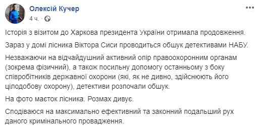 "История с визитом в Харьков президента Украины получила продолжение. Сейчас в доме лесника Виктора Сысы проводится обыск детективами НАБУ. Несмотря на отчаянное активное сопротивление правоохранительным органам, а также посильную помощь со стороны сотрудников государственной охраны (которые, как не удивительно, осуществляют его круглосуточную охрану), детективы начали обыск", - написал Кучер, который до того, как был избран нардепом, работал адвокатом.