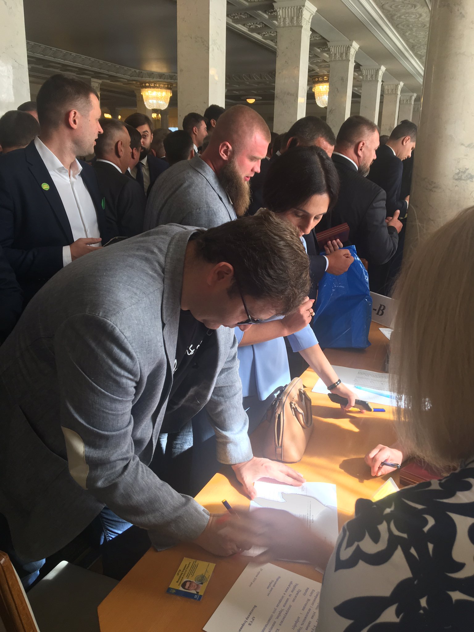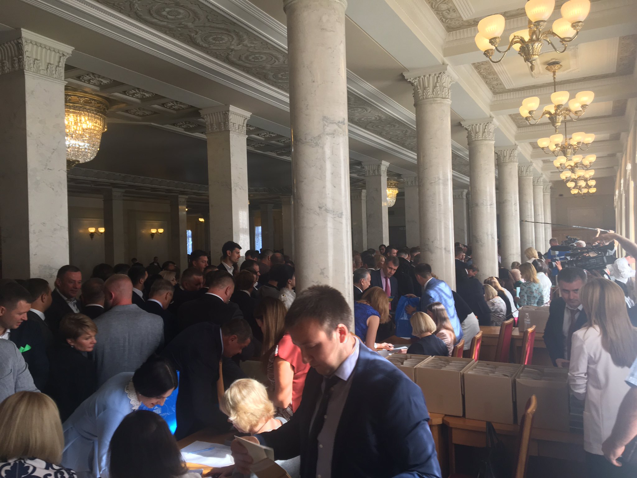 Так, с 10:20 до 13:00, когда начнется первое заседание новоизбранного парламента, у депутатов есть время, чтобы подписать присягу, получить подарочный набор, нагрудный знак и удостоверение, а также карточку для голосования. В здании Рады образовалась внушительная очередь из депутатов, которые собираются это сделать. Отметим, что присягу подписывают у столов регистрации на втором этаже.