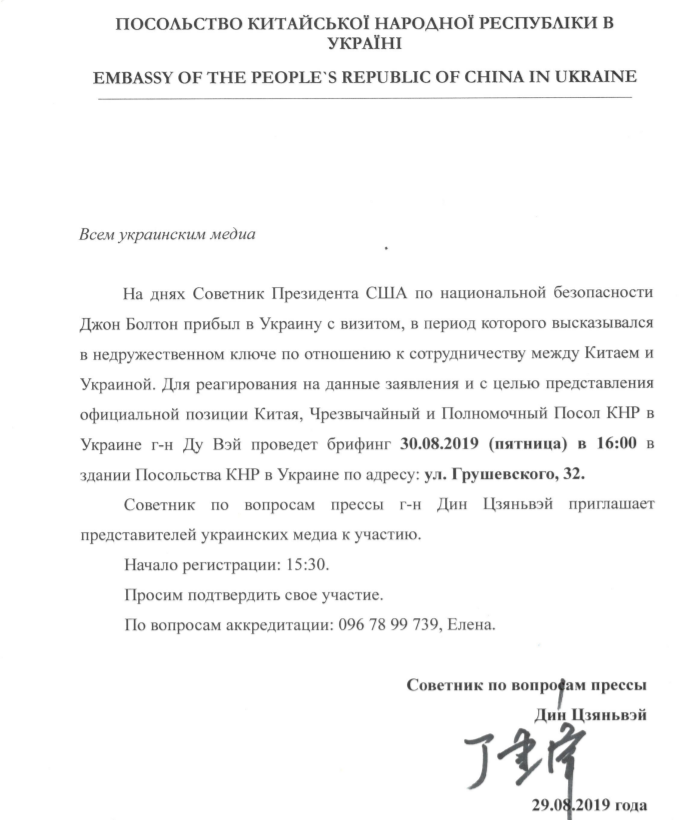 Китайские дипломаты собирают экстренный брифинг в Киеве 30 августа, на 16.00. Журналистов приглашают в посольство, расположенное на улице Грушевского, 32.