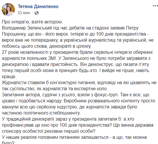 Журналистка Татьяна Даниленко заявила, что Зе-команда довела до абсурда традиции сервильных интервью с президентами.