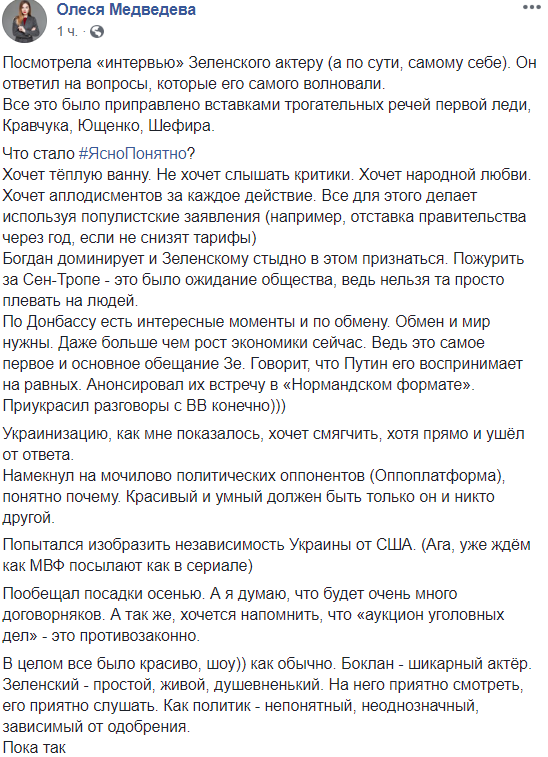 "Посмотрела "интервью" Зеленского актеру (а по сути, самому себе). Он ответил на вопросы, которые его самого волновали.