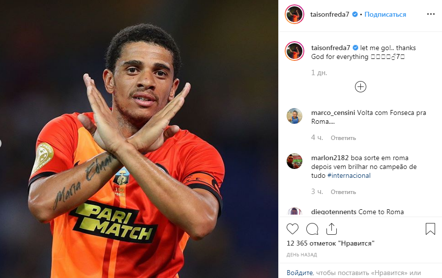 Напомним, что бразильский капитан донецкого "Шахтера" Тайсон в Instagram написал пост, где попросил его отпустить.