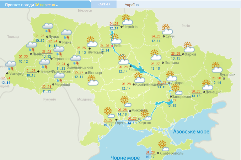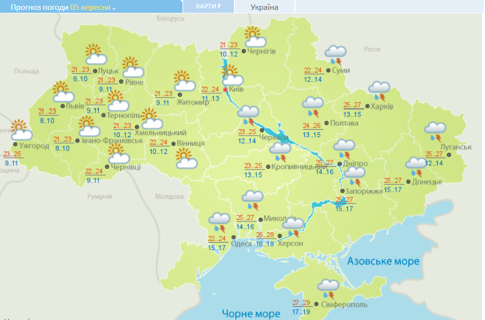 4 сентября по всей территории Украины, кроме восточной части и Приазовья, ожидаются кратковременные дожди с грозами. Днем воздух прогреется до +19...+26 градусов на Правобережье, а на Левобережье до +25...+30. Ночью в западных, северных и Винницкой областях, а также востоке будет +10...+15, на остальной территории +16...+20.