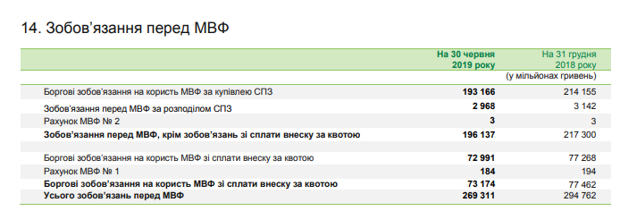 В частности, обязательства НБУ перед МВФ на 30 июня 2019 года составили 269,311 млрд грн. А кредиты МВФ сократились с 214,155 млрд грн до 193,166 млрд грн.