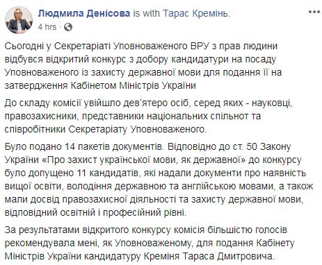 Конкурс на должность уполномоченного по защите государственного языка выиграл бывший народный депутат Тарас Кремень, заявила в Facebook уполномоченный Верховной Рады по правам человека Людмила Денисова.