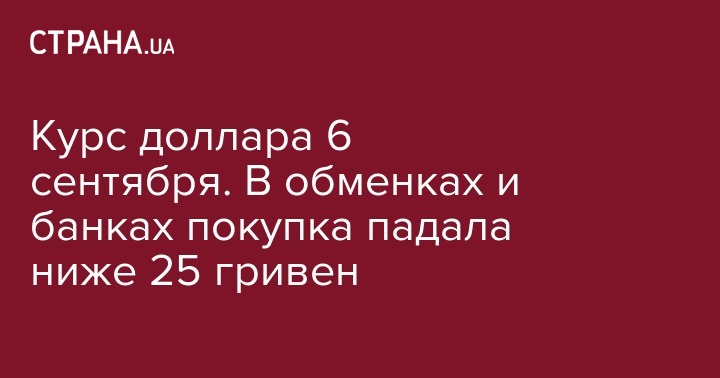 6 сентября НБУ поднял курс доллара на 5 копеек - до 25,31 грн по сравнению со вчерашним днем. В обменках к вечеру доллар покупают за 25,09 грн, продают - за 25,13 грн, не смотря на то, что котировки в обед падали ниже 25 грн в продаже. На межбанке к вечеру курс упал на 11 копеек: 25,05 грн в покупке и 25,08 грн - продажа. В банках доллар покупают от 24,80 грн до 25,20 грн, продают от 25,15 грн до 25,45 грн.