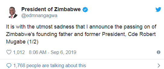 "Невероятно горько объявлять о смерти отца-основателя Зимбабве и бывшего президента Роберта Мугабе", - написал нынешний глава государства.