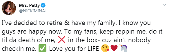 "Я решила уйти и посвятить себя семье. Знаю, что вы, ребята, будете довольны", − написала певица, обращаясь к недоброжелателям. "Обращаясь к фанатам − поддерживайте меня, делайте это вплоть до моей смерти. Буду любить вас всю жизнь", - добавила Минаж.