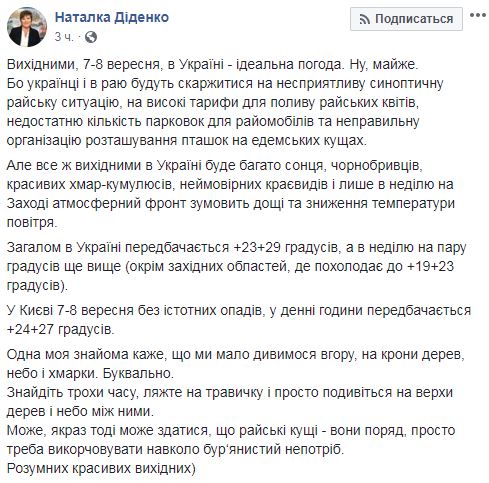 При этом Диденко подшутила над украинцами за постоянное недовольство прогнозом погоды. "Украинцы и в раю будут жаловаться на неблагоприятную синоптическую ситуацию, на высокие тарифы для полива райских цветов, недостаточное количество парковок для раймобилей и неправильную организацию размещения птиц на эдемских кустах", - пошутила синоптик.