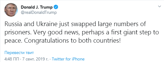 "Россия и Украина только что обменялись большим числом заключенных. Очень хорошие новости, вероятно, первый гигантский шаг по направлению к миру. Поздравления обеим странам!", - сказано в сообщении.
