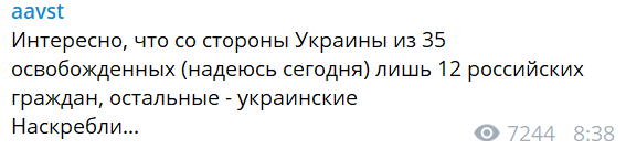 "Интересно, что со стороны Украины из 35 освобожденных (надеюсь сегодня) лишь 12 российских граждан, остальные - украинские. Наскребли", - пишет главред "Эха Москвы" в Телеграм.