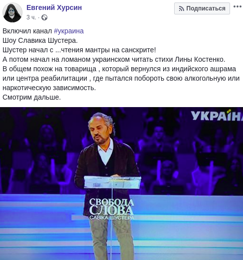 "Включил канал #украина. Шоу Славика Шустера. Шустер начал с ...чтения мантры на санскрите. А потом начал на ломаном украинском читать стихи Лины Костенко. В общем похож на товарища , который вернулся из индийского ашрама или центра реабилитации , где пытался побороть свою алкогольную или наркотическую зависимость. Смотрим дальше", пишет Евгений Хурсин.