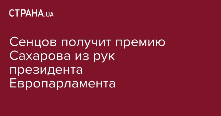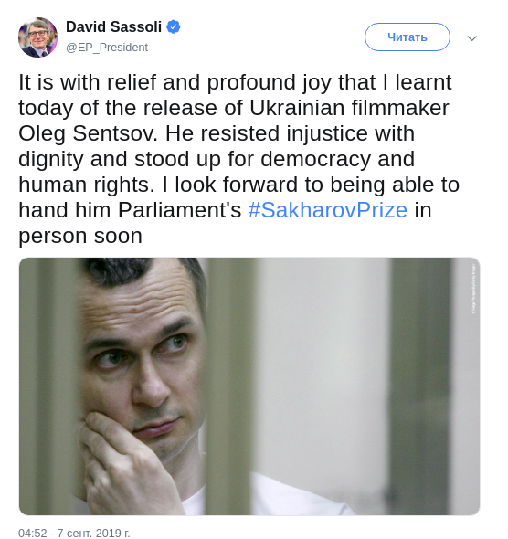 Президент Европейского парламента Давид-Мария Сассоли сообщил о том, что рад освобождению украинского режиссера Олега Сенцова. Сассоли так же ждет возможности лично вручить режисеру премию Сахарова. Об этом президент Европейского парламента написал на своей странице в Twitter.