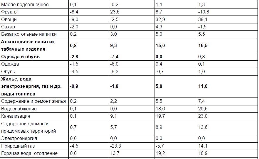 Одежда и обувь подешевели на 2,8%. Снижение цен (тарифов) на жилье, воду, электроэнергию, газ и другие виды топлива на 0,9% произошло за счет снижения цен на природный газ на 4,5%.