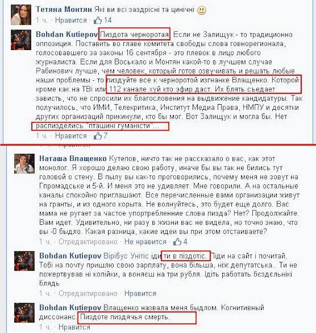 "Я считаю так: чтобы не было потом визга о притеснениях свободы слова, журналистов должны пиз@ть сами журналисты. А журналисток – журналистки. Тех, которые ставят тупые вопросы, просто сажать на место и выводить из зала. А тех, кто под видом журналистов приходит провоцировать от Шария, Медведчука или из кремлевских помоек типа Страны.юа – беспощадно пиз@ть. С – Саморегуляция", – написал Кутепов.