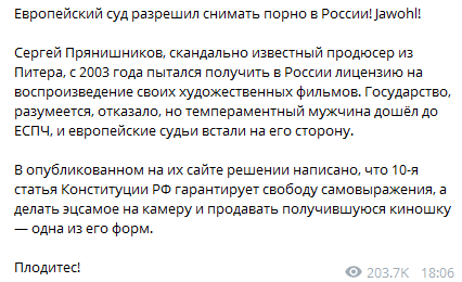 Европейский суд постановил, что 10-я статья Конституции РФ гарантирует свободу самовыражения, а съемки порнофильмов - одна из его форм.