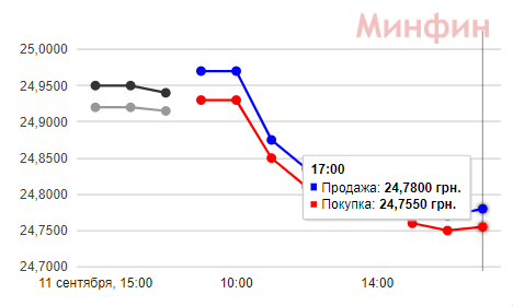 Напомним, 6 сентября доллар первый раз упал ниже отметки в 25 грн. 9 сентября валюта показала котировки в пределах 24,95/24,975 гривен за доллар. 11 сентября торги на межбанке показали 9-копеечное снижение котировок: 24,91 грн - покупка и 24,94 грн - продажа.