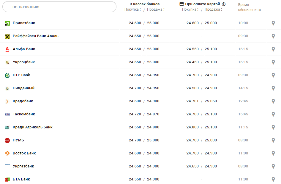 В банках курс доллара с утра был такой: покупка от 24,50 грн до 27,05 грн и продажа - от 24,83 грн до 27,70 грн. В обед доллар покупают от 24,50 до 24,74 грн и продают от 24,75 грн до 25,30 грн. К вечеру доллар покупают за 24,50-24,77 грн и продают за 24,79-25,30 грн. В Приватбанке цена на валюту такая: 24,6 грн - покупка и 25 грн - продажа.
