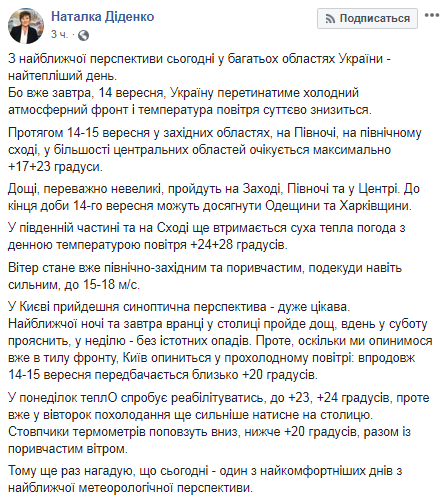 "Поэтому еще раз напоминаю, что сегодня - один из самых комфортных дней в ближайшей метеорологической перспективе", - написала Диденко.