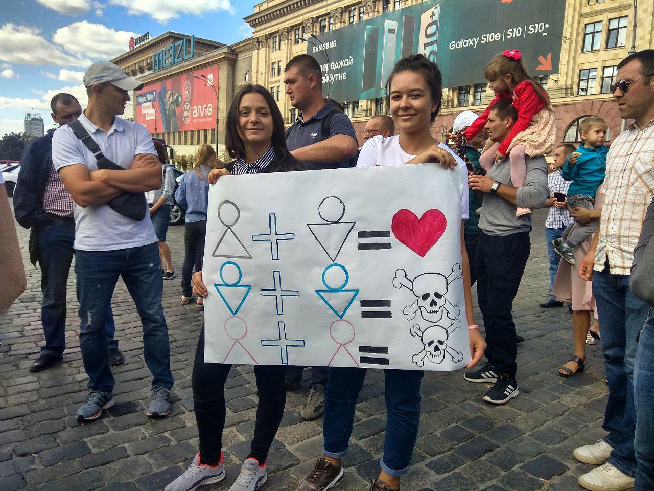Перед началом марша, около 14:00, на оцепленную полицией площадь начали пускать людей. Наряду с участниками гей-парада туда прошли и его противники. Они развернули самодельные плакаты "Папа, мама, дети, дом! Украина не Содом!", "За традиционные семейные ценности" и другие.