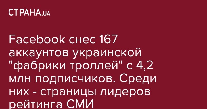 Facebook снес 167 аккаунтов украинской "фабрики троллей" с 4,2 млн подписчиков. Среди них - страницы лидеров рейтинга СМИ