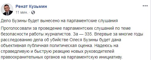 "Проголосовали за проведение парламентских слушаний по теме безопасности работы журналистов. За - 335. Впервые за многие годы расследованию дела об убийстве Олеся Бузины будет дана объективная публичная политическая оценка. Надеюсь на справедливую и быструю реакцию новых руководителей правоохранительных органов на парламентскую инициативу", - сообщил Кузьмин.