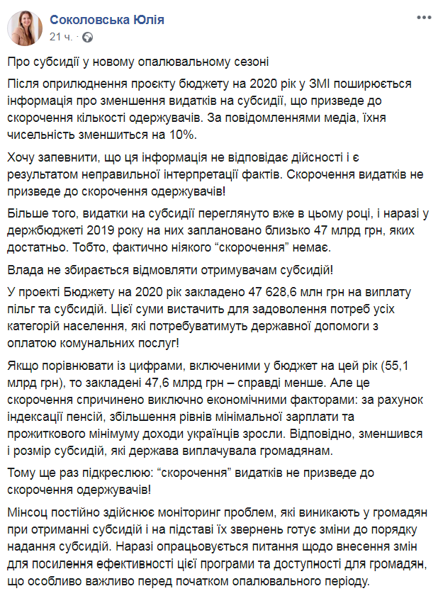"Сокращение расходов не приведет к сокращению получателей. Более того, расходы на субсидии пересмотрены уже в этом году, и сейчас в госбюджете-2019 на них запланировано около 47 млрд грн, которых достаточно. То есть фактически никакого сокращения нет. Власть не собирается отказывать получателям субсидий!" - написала министр.