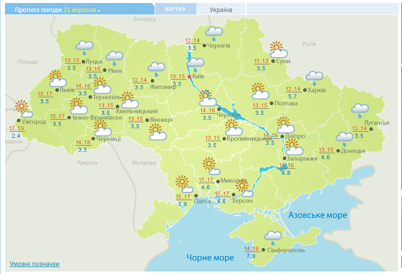 В субботу, 21 сентября, в Украине ожидается прохладная и дождливая погода. Об этом сообщает пресс-служба Укргидрометцентра.