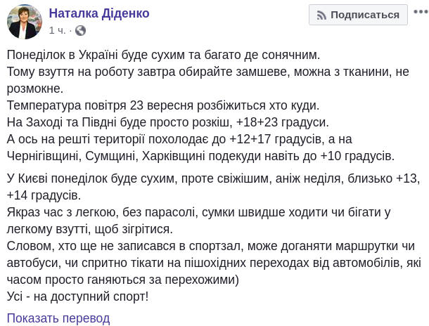 "На западе и юге будет просто роскошь, +18...+23 градуса. А вот на остальной территории похолодает до + 12... + 17 градусов, а на Черниговщине, Сумщине, Харьковщине иногда даже до +10 градусов", - написала синоптик.