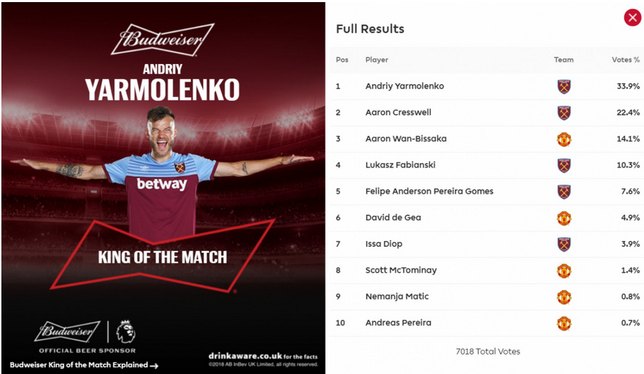 Но кроме этого наш легионер признан лучшим игроком матча и в опросе болельщиков Вест Хэма в официальном аккаунте в Twitter. Украинец получил от болельщиков 35% голосов.